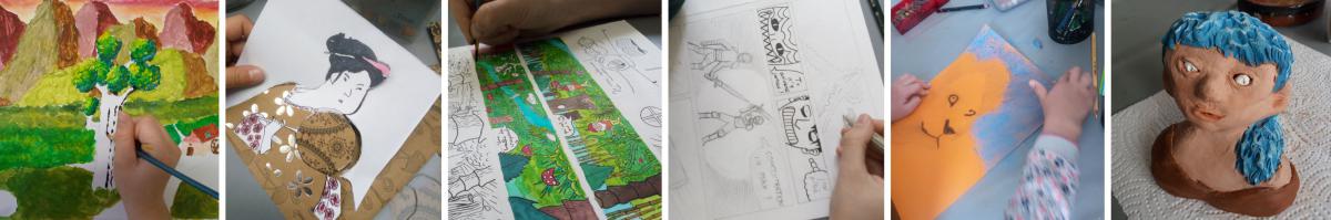Les élèves découvrent de multiples techniques de dessin et de peinture en variant les formats et supports, selon le thème qu'ils auront eux-même choisi en amont de la séance.